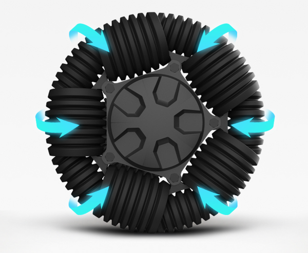 Robooter’s omni wheels use small rollers to allow movement forward, backward, and sideways. This enables superior manoeuvrability, effortless turning in tight spaces, and even the ability to climb small obstacles or curbs.